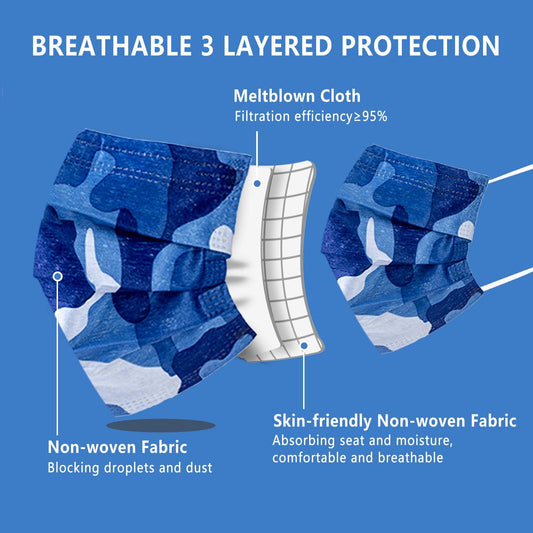 Disposable Face Masks, Blue Camo Print, 50 Pcs, Plastic Bagged