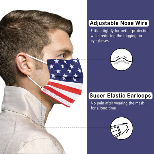 Disposable Face Masks, Amercian Flag Print, 50 Pcs, Plastic Bagged