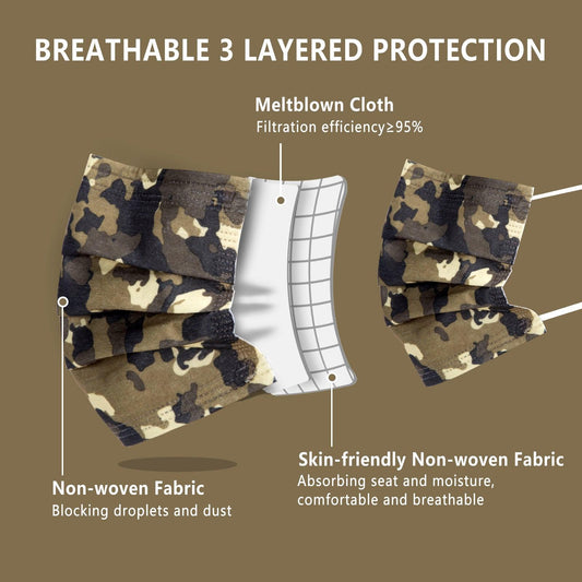 Disposable Face Masks, Green Camo Print, 50 Pcs, Plastic Bagged