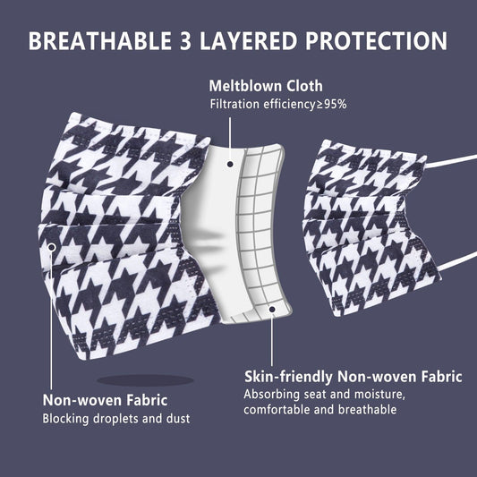 Disposable Face Masks, Houndstooth Print, 50 Pcs, Plastic Bagged